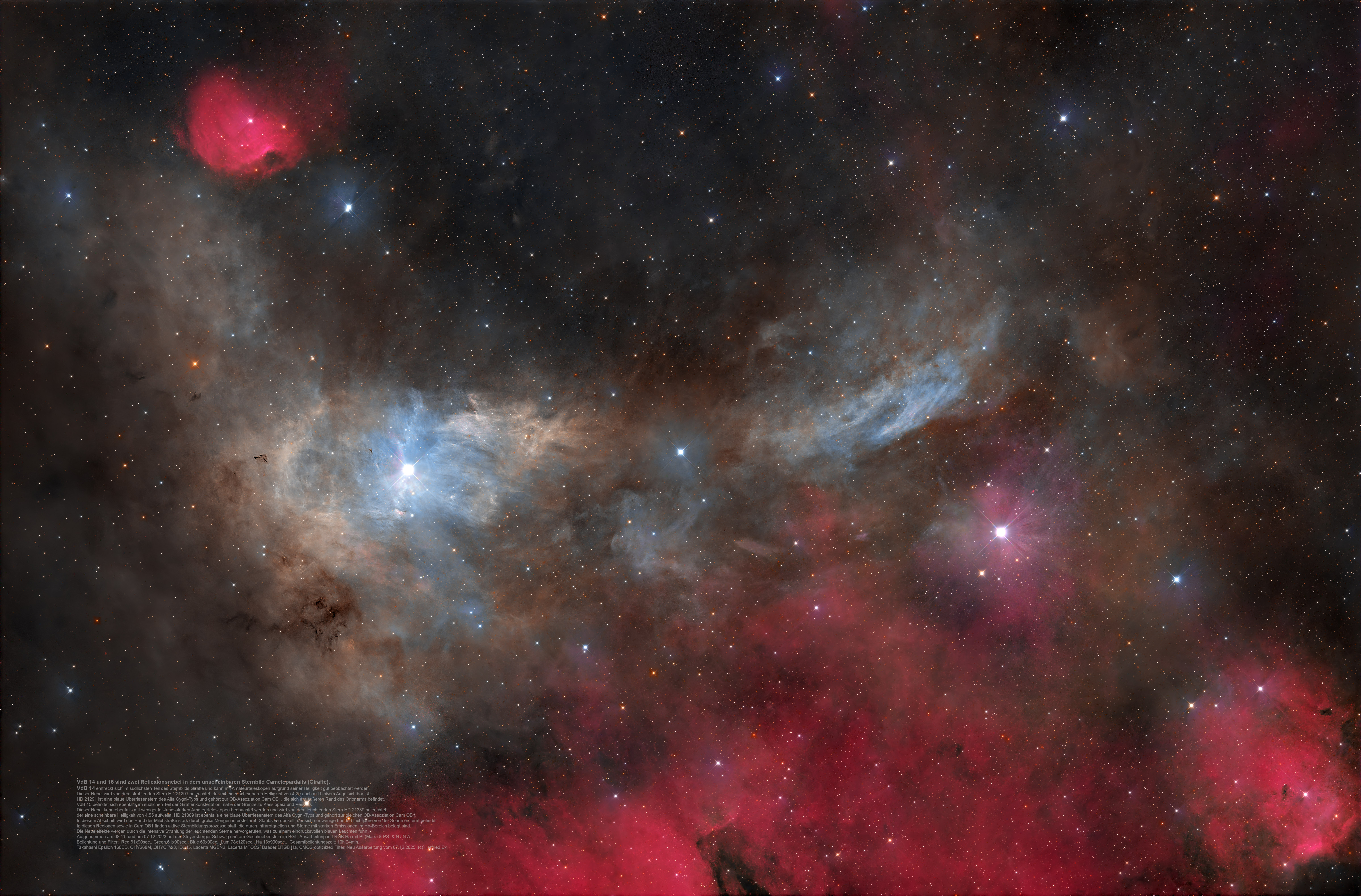 VdB 14 and 15 are two reflection nebulae in the inconspicuous constellation Camelopardalis (giraffe).