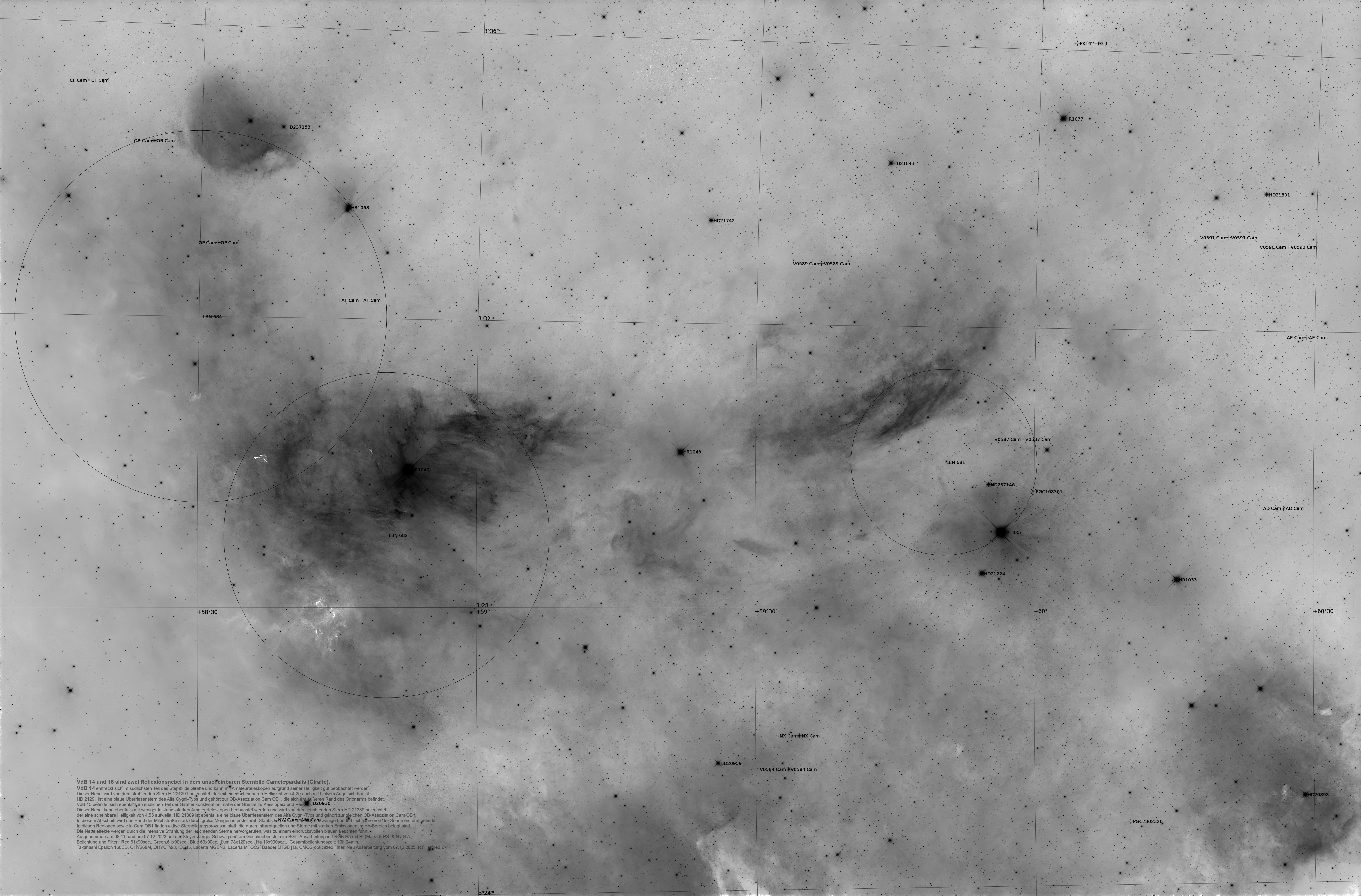 In this section, the band of the Milky Way is strongly obscured by large amounts of interstellar dust, which is located only a few hundred light-years from the Sun. In these regions, as well as in “Cam OB1”, active star formation processes take place, which are caused by infrared sources and stars with strong Emissions in the Hα range are documented.
