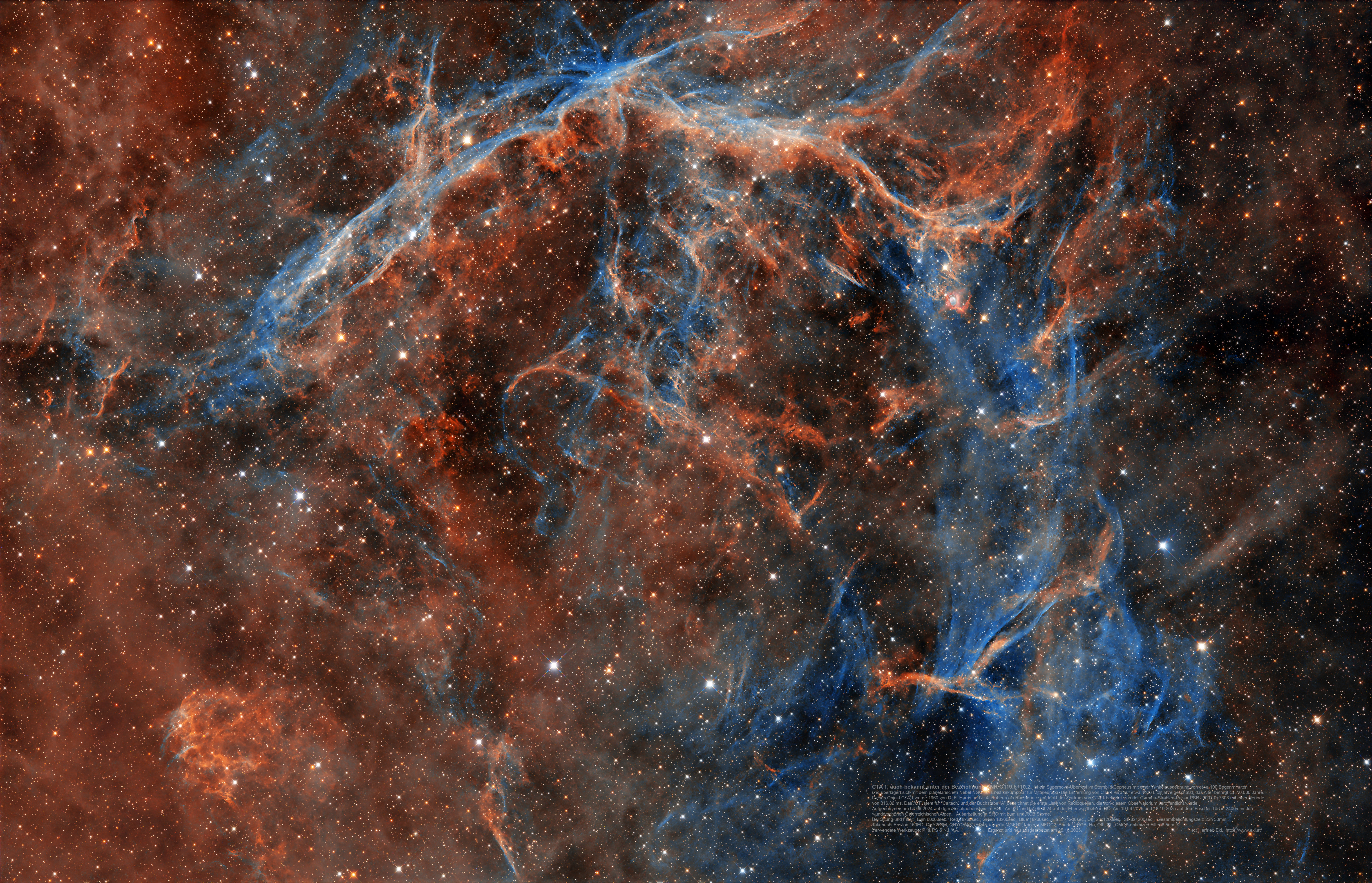 The main element of the image is the ancient and dimly luminous supernova remnant W 63 (SNR G082.2+5.3) in the constellation Cygnus. The object, located approximately 5,000 light-years away, has a perspective size of approximately 86' x 65' and a real diameter of about 150 light-years.
