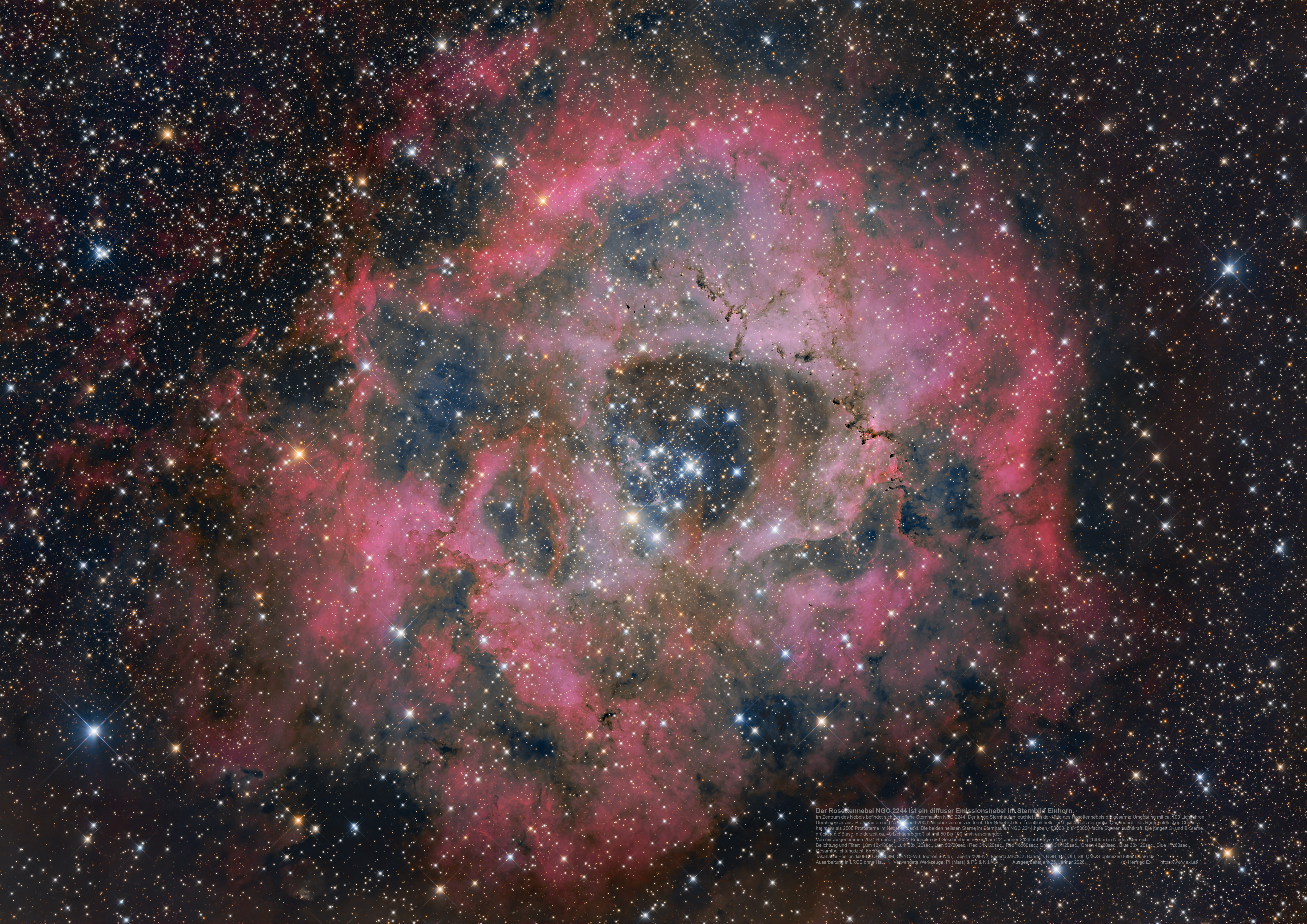 Im Zentrum des Nebels befindet sich der offene Sternhaufen NGC 2244.